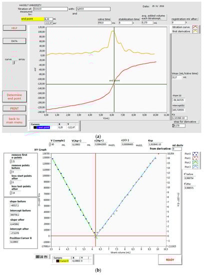 It should be noted that no grid data are ignored in the neighborhood of the equivalence point, while at the beginning and the end of the titration curve, 60% of the data are omitted to obtain two intersecting regression lines (Figure 5b and Figure 6b) with optimal correlation coefficients [16]. Ksp is calculated by Equation (8). Additionally, the analytical concentration of silver ions, as well as the chloride concentration, is calculated via the slope and intercept of Equation (12), respectively. Alternatively, the chloride concentration can be calculated by means of the volume titrant at the intersection of the two linear regression lines in the Gran plot.