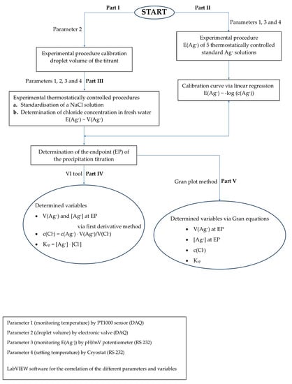 A powerful semi-automated analytical setup was developed for monitoring multiple variables using a low-cost multifunction Data Acquisition Board (DAQ) [8] and a homemade LabVIEW™ program. In this study, the chloride concentration in a temperature-controlled, unknown NaCl solution, as well as in natural surface water, is determined. On a hardware level, the semi-automated setup is equipped with a temperature sensor and an electronic valve controlled by the DAQ, while a pH/mV potentiometer and a cryostat to maintain a pre-set temperature are connected with the computer via a RS 232 interface port. On the software level, in this laboratory environment, the potential, E(Ag+), is monitored during a potentiometric precipitation titration of a primary standard NaCl solution with a standard AgNO3 solution using a pH/mV potentiometer. At the end point of the titration, E(Ag+) and the added volume of the AgNO3 (V(Ag+)) are determined by the Virtual Instrument (VI) numerical first derivative tool in the LabVIEW™ 2015 SP 1 (version 15.0.1) software. Via the well-known titration formula (c(Cl−)) can be calculated. Via the calibration curve, E(Ag+) versus –log (c(Ag+)) for different thermostatically controlled AgNO3 standard solutions, the equilibrium concentration of Ag+ i.e., [Ag+] at the end point is derived, and thus, the solubility product of silver chloride (Ksp) at 298 K.