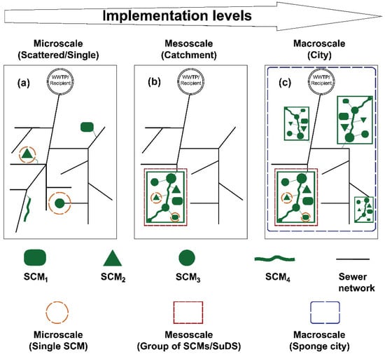 Different levels of implementation for SuDS/SCMs, (a) Microscale, (b) Mesoscale, and (c) Macroscale.