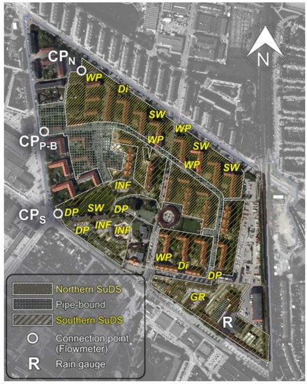 The locations of rainfall and runoff monitoring points as well as the catchment delineation in Augustenborg. The unmarked areas within the borders of the Augustenborg area are directly drained into the existing municipal pipe-bound combined sewer network. Connection points marked as CPN, CPP-B, and CPS are the discharge points for the Northern retrofit, the pipe-bound catchment, and the Southern retrofit, respectively. Note that the flow is in the north-west direction, i.e., towards the connection points [21]. For SCM types, see Figure A1. Background picture: GSD-Orthophoto, courtesy of The Swedish Mapping, Cadastral and Land Registration Authority, ©Lantmäteriet (2015). [This figure—slightly modified—is adopted from Haghighatafshar et al. [11] with permission].
