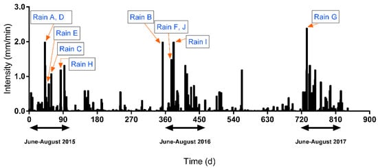 Discharges from the sub-catchments were monitored and logged at connection points (marked as CP in Figure 2). The flow was measured using Mainstream Portable AV-Flowmeters with velocity and level sensors. Flow-monitoring was carried out for a period of over two years, which is shown in Figure 3. A total of 10 rainfall events (denoted A–J) with reliable corresponding flow measurements were selected. The selected rainfalls were all volumetrically considered, which means that they led to a discharge from at least one of the SuDS in Augustenborg. As seen in Figure 3, all selected rainfalls belong to the period of May–August during which most intense rainfalls were observed. Details of the selected rainfall events are shown in Table 2. The rainfall was monitored and logged by a Casella CEL tipping bucket rain gauge with 0.2 mm resolution, which was installed at the south-east part of the area.