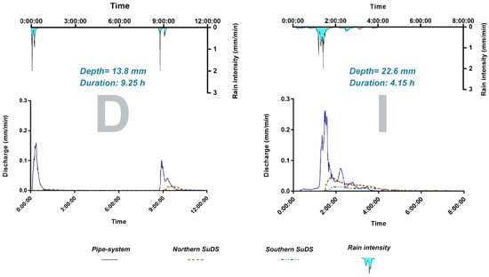 All 10 rainfall-runoff datasets (hyetographs and hydrographs) included in this study are provided as supplementary material. Figure 4 shows two examples of the observed rainfall-runoff events. Rainfall I (Figure 4(I)) is the most intensive rainfall event with a recurrence interval of about two years according to Dahlström (2010) [28]. It has one peak with a large depth that leads to discharges from both the Northern and the Southern SuDS. Rainfall D (Figure 4(D)), however, consists of two peaks while the discharge occurs only from the Northern SuDS and only in connection to the second peak.