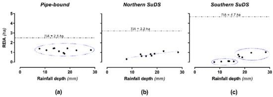 The same conceptual model is also valid for the REIA trend observed for the Southern SuDS. As seen in Figure 5c and Table 2, the calculated REIA is almost negligible for rainfall depths up to about 16 mm while a dramatic increase is observed in the case of 17 mm of rainfall. The same concept presented above (discrete mini catchments) explains the observed phenomenon. A possible explanation for this very abrupt alteration in behavior (sudden jump in REIA from 16 mm to 17 mm of rainfall) could be associated with the relatively large retention volume at the most downstream part of the Southern SuDS (see Figure A1(DP 4)). Another possible explanation could be that some other mini catchments further upstream join the rest of the system when a threshold is exceeded. Both hypotheses could generate a relatively large outflow volume considering the possible connectedness of the catchment at that stage after the initial 16 mm has filled up the capacity up to the system’s threshold. However, application of the concept to the systems in Augustenborg could possibly reveal what hypothesis is a valid explanation for the observed phenomenon.