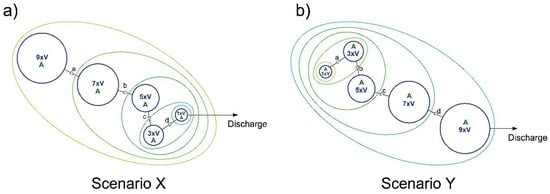 A schematic illustration of the conceptual model is presented in Figure 6. In this illustration, five retention cells (SCMs) with each having a connected mini catchment area = A are presented. The constant connected area, A, for each SCM is assumed to promote the comprehensibility of the conceptual model. Each of these SCMs has a certain retention capacity as different multiples of an assumed unit capacity (i.e., V [mm]). The retention capacity of each SCM is reflected in the size of the schematic circles in Figure 6. As evident in Figure 6, both illustrated models have identical total retention capacity (=25 × V), but the circumstances under which a discharge is initiated from the systems depend on the spatial distribution of the mini catchments with respect to their retention capacity. It is important to note that retention capacity, V, in this context is considered the sum of surface storage, retention, and losses in the form of infiltration and evapotranspiration.