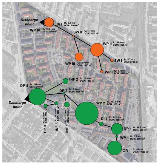 Distribution of different types of surfaces in the catchments in Augustenborg extracted from Reference [21].