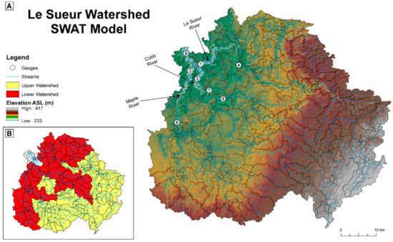 To address these issues, we turn to a subwatershed of the Minnesota River Basin (MRB), the Le Sueur watershed in south-central Minnesota, USA (Figure 1). The Le Sueur watershed exhibits a strong erosional response to increased high flows due to deeply incised valleys in the lower watershed [,,,]. We investigate here the extent to which increased water storage can reduce both (1) high flows in the lower watershed and (2) the resulting erosion of and sediment loading from bluffs. The results presented in this study can aid in the evaluation of management options intended to reduce sediment loading through flood attenuation.