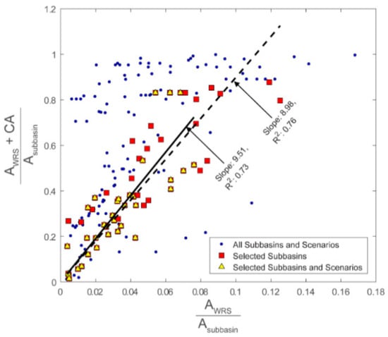 Relationship between WRS extent in a sub-basin (AWRS/Asubbasin) and the sum of WRS contributing areas and surface areas as a fraction of sub-basin area ((AWRS + CA)/Asubbasin). See Section 3.1 for details.