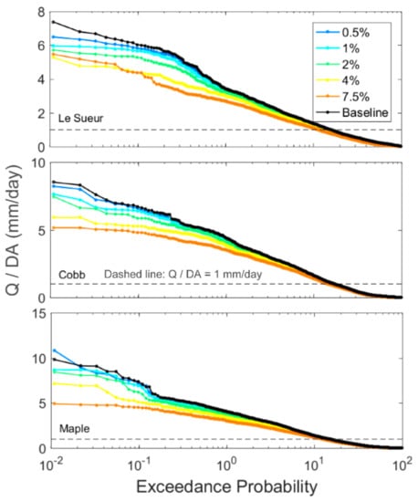 Figure 4 shows an example of the flow reductions offered by WRS scenarios. Here, WRS were placed throughout the entire watershed, depths of 1 m were used, and K = 3.6 mm/h. With few exceptions, high flows tend to gradually decrease with increasing WRS extent. The highest reductions are achieved within the top 1% of flows, while the sediment-loading threshold of 1 mm/day occurs at exceedance probabilities between 10% and 20% (Figure 4).