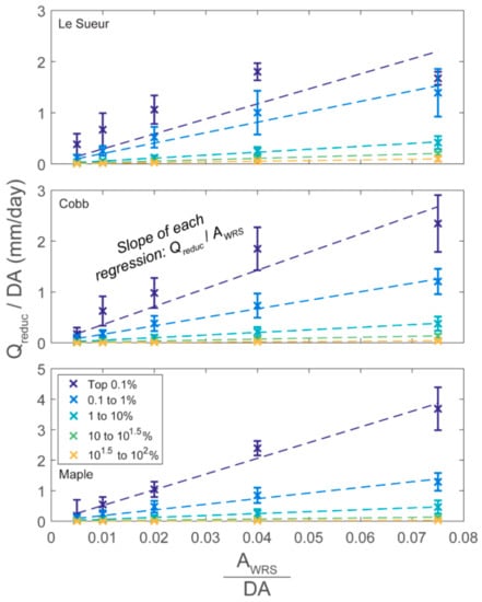 Example of the linear regressions between WRS extent (AWRS/DA) and average normalized discharge reductions (Qreduc/DA) for flows binned by exceedance probability (shown in legend). Here, we use depths of 1 m, K = 3.6 mm/h, and WRS placement throughout the entire watershed (Figure 4). Error bars represent the standard deviations of discharge reductions.