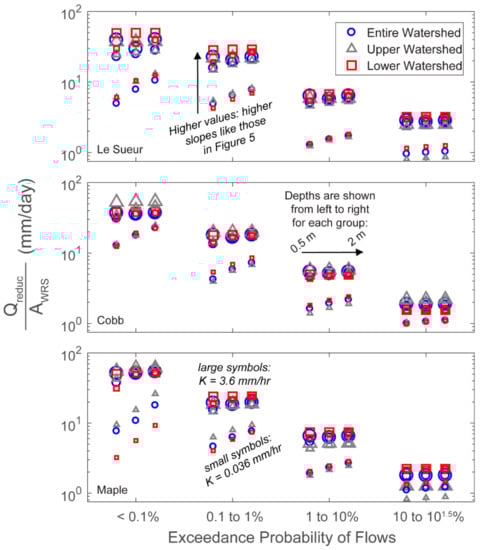 Flow-reduction slopes (Qreduc/AWRS; Figure 5) for all WRS scenarios. Here, small, medium, and large symbols represent K = for 0.036, 0.36, and 3.6 mm/h, respectively, and symbol style corresponds with WRS placement in the watershed. Points on the left, center, and right of each flow group correspond with design depths of 0.5, 1, and 2 m.