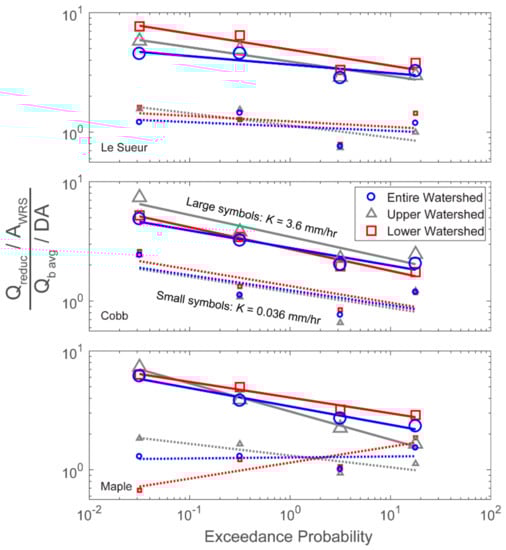 Constructed water storage sites distributed throughout a watershed can reduce high flows and, consequently, sediment loading from near-channel sediment sources. We present relationships between WRS contributing areas and WRS extent that allow for flexibility in assessing scenarios over a range of design depths and site placement strategies in the Le Sueur watershed. Site performance depends primarily on K because of its role in enhancing seepage and reducing overflowing. We note that we used K as a means to control drainage of the WRS. While K is not easily manipulated over large spatial scales, our simulations are on the low end for K’s mapped throughout the watershed and engineered structures could be utilized to attain whatever drainage rate is needed at each individual site. The key point is that optimal solutions detain water sufficiently long to desynchronize the high flows downstream but drain sufficiently rapidly to have storage capacity available for the next rainfall event. Higher design depths can enhance flow reductions from sites with low K values. Results have only slight differences between different site placement scenarios (e.g., entire watershed vs. upper or lower), suggesting site placement is not a first-order control on site performance in this watershed. Flow reductions in our SWAT model exhibit a power-law scaling with exceedance probability that enable generalized flow-reduction relationships. These relationships accurately reproduce our results and may be applicable to real flow duration curves.