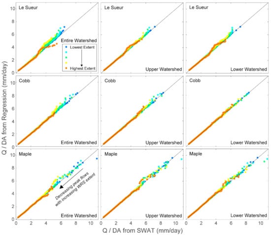 Each river’s normalized discharge values (Q/DA) in WRS implementation scenarios from both SWAT and Equation (4). All placement scenarios are shown here for scenarios using design depths of 1 m and K = 3.6 mm/h (regressions shown in Figure 7). Only flows with exceedance probabilities <32% are shown here.
