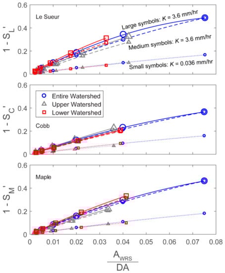 Reductions in the normalized sediment-loading rates from the bluffs between each river’s upper and lower gauges (SL’, SC’, and SM’) vs. WRS extent (AWRS/DA) in scenarios using WRS depths of 1 m. Sediment loading decreases with increasing WRS extent and K. Polynomial regressions are shown for each scenario.