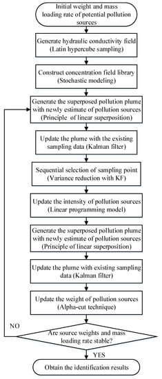 Flow diagram of the pollution source identification using the proposed Kalman filter-based method.