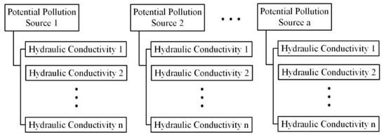 Given the weight and mass-loading rate of potential pollution sources ((wj, mj), j = 1, …, a), the concentration field corresponding to each hydraulic conductivity realization is generated utilizing the following procedures (Figure 3). First, according to the weight value of each pollution source, randomly select the concentration field from the n concentration fields and assign the zero concentration field to unselected ones. Second, multiply the concentration fields by the mass-loading rate of the pollution sources. Third, superpose the concentration fields under the same hydraulic conductivity field. Lastly, we generate the n concentration field realizations with the given weight and the mass-loading rate.