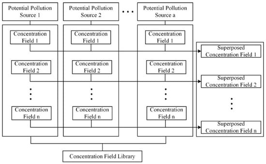 In the concentration field library, there are n non-superposed concentration fields for each potential pollution source and the resulting mean concentration field of these n concentration fields is named as a “single pollution plume”. If there are five potential pollution sources, it corresponds to five single pollution plumes.