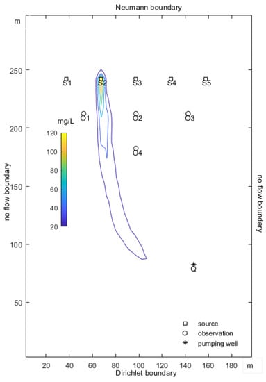 In this problem, on the basis of the site investigation, there are five potential pollution sources (S1–S5) in the aquifer domain, but the mass-loading rate of pollution source is unknown. The fact is that there is only one true pollution source at S2 with the mass-loading rate of 500 g/day and a pumping well with a flow rate of 150 m3/day is missed by accident in the site investigation. The potential pollution sources (S1–S5) and the missing pumping well (Q) are shown in Figure 5.