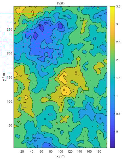 This study area is a two-dimensional, heterogeneous, isotropic confined aquifer measuring 300 × 200 m. The flow domain is bounded by the constant-head boundary on the south side, flow boundary on the north side, and no-flow boundaries on the other sides (Figure 5). The head values for the south side is equal to 10.0 m. The flow rate along the north side is 1.0 m2/day.