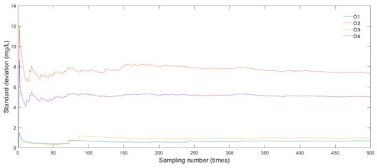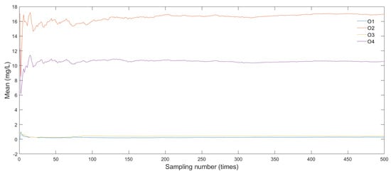 Figure 7 and Figure 8 are the iterative curves of mean and standard deviation for O1–O4, respectively. It can be seen that the mean value and standard deviation gradually reach a stable state with the increase of the sampling number and nearly converge after about 350 iterations (samplings). Therefore, the concentration field library obtained from LHS with 500 samplings is adequately satisfactory to be used for subsequent pollution source identification.