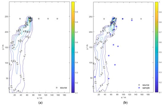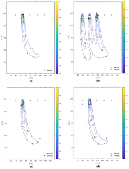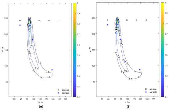 Figure 9 are the normalized contour maps of the pollution plume. Figure 9a shows the true plume and Figure 9b–f shows the pollution plume updated with 1, 2, 3, 4, and 6 monitoring sampling data, respectively. As the number of samplings increases, the shape of the pollution plume gradually approaches that of the true pollution plume.