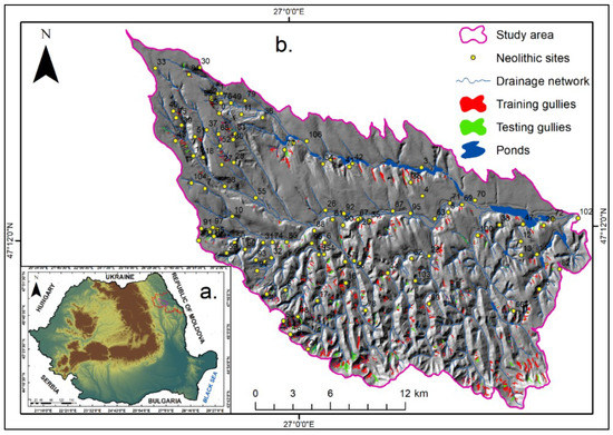 (a) Location of the study area in Romania; (b) Location of training and testing gully dataset and of Neolithic sites.