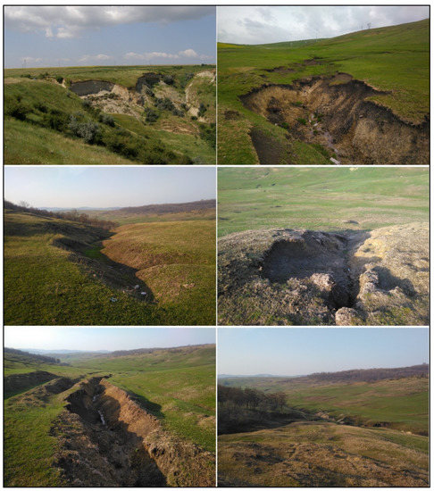 The lithological setting of the area is characterised by non-cohesive deposits of Bessarabian age (an alternation of marls, clays with intrusions of sand, and oolithic limestone); the fine granulation of these lithological deposits led to the triggering and developing of geomorphological processes, especially gullying (Figure 3). More details regarding the geomorphic characteristics of this area can be found in the literature [35,36,37,38,39].