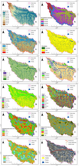 Drainage density is another important factor in assessing gully erosion susceptibility [8,25]; high values of this parameter are associated with large surface runoff ratio. This parameter was calculated using the line density tool in ArcGIS and reclassified into four classes as follows <0.64, 0.65–1.2, 1.3–1.8, and 1.9–3.2 km/km2 (Figure 4i).