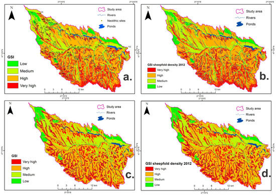 The final GSI is calculated and shown in Figure 5a. According to the gully susceptibility map developed with the help of the FR method, 18.71% (102.72 km2) of the total catchment is found under a very high susceptibility, 52.37% (287.56 km2) high susceptibility; medium and low susceptibility represent 24.03% (131.93 km2) and 4.89% (26.80 km2) from the total area, respectively. High and very high classes occupy more than half of the basin’s surface (over 70%), which is an alarming fact for the cultural heritage sites of the area. When calculating the GSI including the sheepfold density factor (Figure 5b), 19.81% (108.73 km2) of the total catchment is found under a very high susceptibility, 51.45% (282.5 km2) with high susceptibility; however, medium and low susceptible classes represent 23.87% (131.06 km2) and 4.87% (26.72 km2) from the total area, respectively. As can be observed, there are no significant differences between the maps and percentages when we added sheepfold density as a conditioning factor.