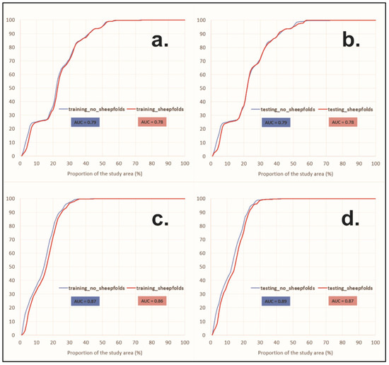 During the digitisation process, it was observed that gully erosion is closely related to another process—landslides. Many gullies are initiated by the unconsolidated deposits of the landslides; therefore, there are higher chances of gully triggering around landslides. Out of the total number of 677 gullies, 457 gullies intersect with a landslide (there is a total of 764 landsides) [39]. In order to realize the final susceptibility maps, a set of ten environmental factors were used; namely, elevation, precipitations, slope angle, curvature, lithology, drainage density, topographic wetness index, landforms, aspect, and distance from rivers. To these ten conditioning factors, we have added sheepfolds as a conditioning factor. We try to figure out if overgrazing is influencing the final GSI and if better validation results are obtained in this way.