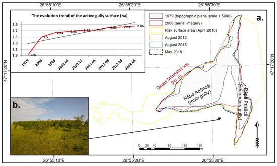 (a) Băiceni-Cucuteni gully evolution over the last 39 years, (b) the forest developed on the upper part of the gully.