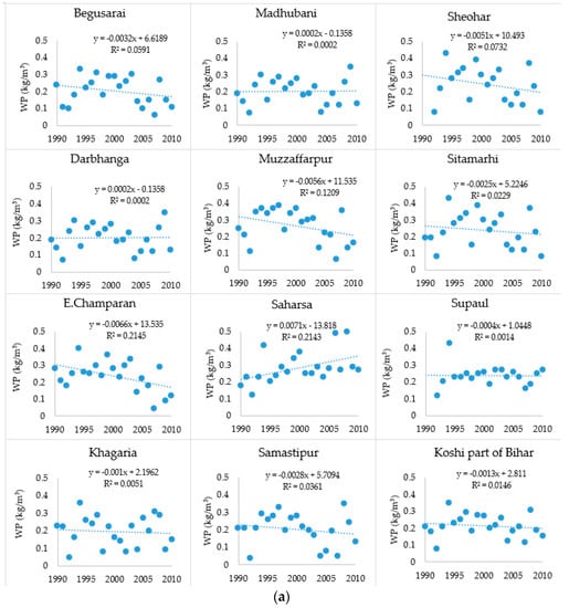 The rice WP and rice yield over time in the selected districts are shown in Figure 3a,b. The WP trend over the area as a whole was negative over the twenty-year period. Most individual districts also showed a decreasing trend in WP, but three districts (Darbhanga, Madhubani, and Saharsa) showed a small positive trend. Two of these (Darbhanga and Madhubani) had a very low WP even after the small improvement, but the third (Saharsa) had the highest WP of all districts. The district with the lowest WP (Khagaria) also showed a negative trend over time. The seasonal CWU differences of the selected districts are shown in Figure 3c.