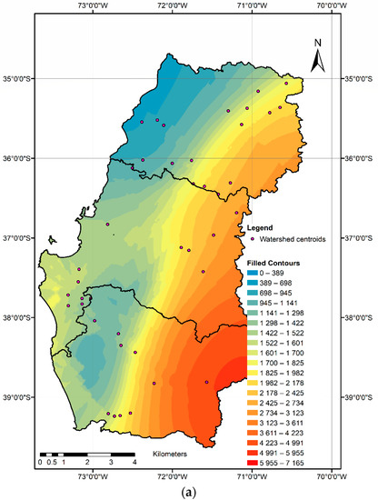 Precipitation variability in both spatial and temporal terms is influenced by atmospheric thermodynamics, which depend on topography and relief, introducing marked imbalances in the spatial distribution of precipitation [7]. Daly et al. [8] hold that the main source of uncertainty in the characterization of the spatial distribution of precipitation is related to mountain height and meteorological factors such as atmospheric stability and moisture availability, among others. Therefore, it proves necessary to estimate precipitation in watersheds with a complex topography such as those of south-central Chile—with the presence of the Coastal Range and the Andes—for appropriate hydrological management.