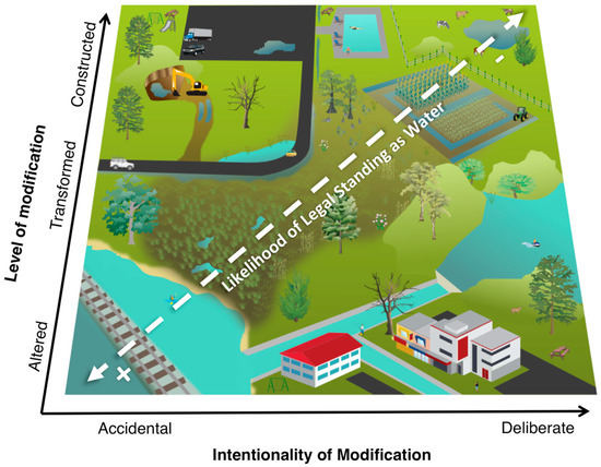 The most clearly artificial aquatic systems are those that humans construct where none existed before. Even the existence of these constructed artificial ecosystems relates to other natural waterbodies because they represent water that could have gone or stayed elsewhere, on the landscape, underground, or to other parts of the hydrologic cycle. Deliberate examples of construction include fountains, many roadside ditches, rain gardens, stormwater treatment areas, many farm ponds, and all designer ecosystems [10]. Conservation-oriented water regulation typically exempts such constructs outright; they usually do not count as water [7,23,24]. Accidental examples include logging ruts, erosional gullies in building sites and agricultural fields, poorly drained impervious surfaces, and even bomb craters [25]. Some of these accidental features represent failures of water conservation regulation or other damaging abstraction from natural water sources. Nonetheless, left unmaintained, in time, such accidental waterbody construction in relative uplands can “naturalize” to a seemingly “wild” ecosystem [25,26,27]. Waterbodies that humans have constructed accidentally, but that appear relatively free from human intent, are more likely to be regulated than waterbodies that humans have constructed on purpose [23,24].