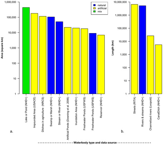 Extent of artificial as compared to natural waterbodies in the U.S. Data drawn from a variety of sources, shown in parentheses. (a) areal features; (b) linear features. Data are taken from the National Hydrography Dataset (NHD+) [48], U.S. Army Corps of Engineers National Inventory of Dams (USACE) [49], U.S. Department of Agriculture Natural Resources Conservation Service (NRCS) [41], Downing et al. [6], U.S. Fish and Wildlife Service (USFWS) [50], Research and Innovative Technology Administration (RITA) [46], and Leopold [42].
