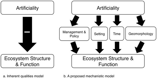 Inherent vs. process-based models of the condition of artificial aquatic systems. (a) inherent qualities model; (b) process-based model. We suggest that scientists and policy-makers have too readily accepted model (a), in which the inherent qualities of artificiality negatively impact ecosystem structure and function, rather than scientifically exploring a mechanistic model such as the one we propose in (b), which breaks the influence of artificiality down into multiple processes.