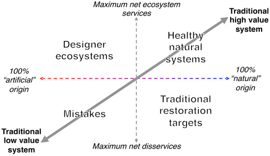 The past several decades have seen ferocious clashes in environmental philosophy and conservation biology over the role of artificial ecosystems. In the 1980s, prominent ethicists lampooned restoration on the grounds that “faked nature is inferior” in much the same way that an art forgery is inferior because it is “a product of contrivance”, lacking “causal continuity with the past” [161], and that man-made natural areas represent “domination, the denial of freedom and autonomy” that defines nature [162]. Some philosophers have since softened this dichotomy, viewing it as a gradient or broadening the criteria that constitute a necessary fidelity to nature [163,164,165]. While naturalness remains valuable by all standards of environmental ethics, many ethicists increasingly distinguish categories (or dimensions) of naturalness, including “as a physical property of species and ecosystems”, such as native biodiversity, and “as a quality of processes that are free of human intervention” [74]. This particular pair of categories, posited as a distillation of values already in wide use, corresponds well with our proposed axes of degree of physical modification and level of intentionality, which U.S. policy tends to reflect [23,29,30].
