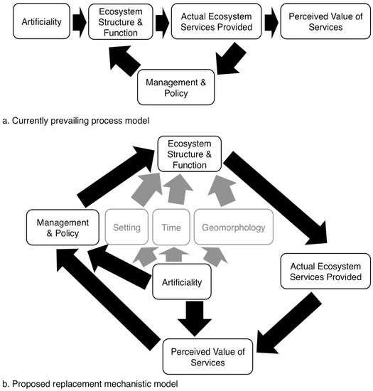 Conceptual diagram of the role of artificiality in the management and services provided by an aquatic ecosystem. (a) the currently prevailing process model depicts an approximation of how environmental scientists appear to typically think of the role of artificiality in impacting ecosystems; (b) our proposed replacement suggests that, while artificiality may impact ecosystem function directly through mechanisms yet little elucidated, we are more certain that it impacts the perceived value of ecosystem services. Because perception impacts policy, policy affects reality, and reality impacts perception, this proposed replacement process model for the role of artificiality in aquatic ecosystems sets up a positive feedback loop.