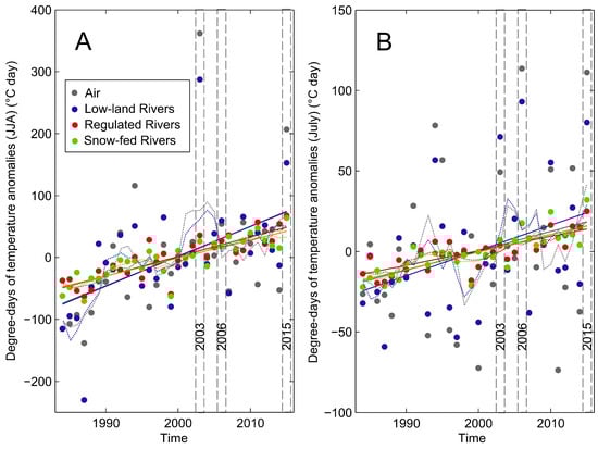 - Salmaso, F.; Quadroni, S.; Gentili, G.; Crosa, G. Thermal regime of a highly regulated Italian River (Ticino River) and implications for aquatic communities. J. Limnol. 2017, 76, 23–33. [Google Scholar] [CrossRef][Green Version]