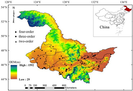 The study region, Heilongjiang Province, is located in the northeastern part of China between 121°13′–135°06′ E and 43°26′′–53°34′′ N (Figure 1). The topography of this province is characterized by mountains to the north and east that surround the central great plains. The Songnen Plain to the west and the Sanjiang Plain to the northeast are two of the most important regions of agricultural production in China [29]. The climate ranges from humid to semi-humid, and the average precipitation is approximately 540 mm/year, with the growing season precipitation (May–September) accounting for 80–90% of the yearly rainfall. Heilongjiang Province has 15.94 million hectares of arable land, which ranks second highest in China, and the per capita arable land is three times the country average. The food crops grown here are mainly rice, maize, and soybean, which cover more than 90% of the total sown area. Water is essential for agricultural development and food production. Although China’s water resources are abundant, the per capita water availability is only 2039.2 m3, which is less than a quarter of the global level, and the per capita water availability in Heilongjiang Province is 2129.8 m3, which is near the average for the country. The water demands of grain production seriously restrict the distribution of water resources to other industries in Heilongjiang Province.