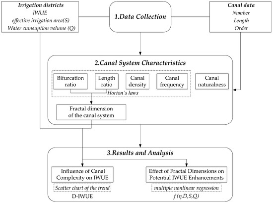 However, previous canal studies have focused only on canal lining methods and seepage prevention materials; thus, the influence of the structure of the canal system on the water distribution and conveyance has been neglected. Few studies have investigated the correlation between the complexity of canal networks and IWUE. Irrigation canal systems similar to the artificial road, water channel, pipeline, and other network systems are based on the laws of nature, thus giving full play to subjective initiatives. These systems have many similarities with fractal systems (such as water systems) formed by self-organization in nature. They are objective reflections of the laws of nature and the characteristics of fractal systems. The principle of fractals has many applications in water system research [15,16,17]. Among several methods for analyzing fractals, Horton’s laws have been widely applied, and they consist of several numerical ratios and represent a theoretical method for analyzing the characteristics of river network geometry. Considerable research has been conducted in this field, and a number of results have been obtained [18,19,20]. Kim and Jung [21] presented an analysis of the geometric properties of drainage structures using Horton’s law and determined a valid range in which scale invariance of the channel network remains the same. Moussa [22] proposed new indices independent of threshold area that have similar properties to the Horton–Strahler ratios. Mantilla et al. [23] extended generalized Horton’s laws to test embedding algorithms for topological river networks. Later, many scholars applied Horton’s law to other fields. Zhang et al. [24] established a model based on the correlation of flooding frequency and fractal dimension to investigate the effect of rapid urbanization-induced changes in river geomorphology on the local flood frequency in Hangzhou. Yang et al. [25] analyzed river network system changes and their impacts on storage and flood control capacity under rapid urbanization. Stankiewicz and Wit [26] reported the correlation between Horton’s ratio of stream numbers and the mean source stream slope.