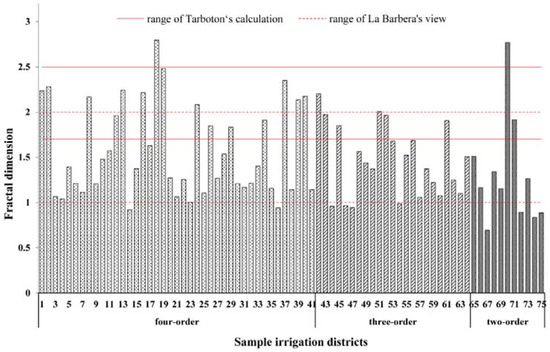According to Equation (5), the dimensions of each irrigation district are shown in Figure 3. The dimension values of the sampled irrigation districts were concentrated between 1 and 2.5, which was within the regular range of the fractal values of Horton’s laws. Ten irrigated areas have a fractal dimension below 1, and Equation (5) shows that the bifurcation ratio is smaller than the length ratio. The bifurcation ratios in this type of irrigated area were on the upper boundary of the general range. Most irrigation areas with fractal dimensions less than 1 had a larger scale, and although the length of the canal system was long, the area was large; therefore, the number of channels in the unit area of the irrigation area was small. As a result, the canal system cannot effectively fill the irrigation area, thus making the fractal dimension smaller. Two irrigation systems had a dimension value higher than the upper limit of 2.5: the Hongwei Irrigation District and the Bayi Irrigation District. Among these districts, the bifurcation ratio of Hongwei Irrigation District is as high as 11.347, the length ratio was only 2.38, the number of sublateral canals was 11 times that of lateral canals, and the length of sublateral canals was only 4 times that of lateral canals. In the process of constructing channels, too much emphasis was placed on quantity, and excavation to a suitable length was not observed. Artificially excavated canals are different from natural river channels, and artificial construction engineering means that the canal system does not have a self-similar structure as observed for natural river networks. This feature resulted in situations where the fractal dimension was too high or too low. The values of the canal fractal dimensions for more than half of the studied irrigation districts were 1.0–1.5. The literature review and field investigation showed that within a reasonable range, a greater fractal dimension of the canal system corresponds to better development of the canal structure [14,41,42]. Therefore, the canal structure still needs to be further optimized.