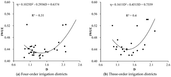 The relationship between the IWUE and fractal dimension D can be seen in Figure 4: (1) the four-order fitting curve was a large-opening parabola with a trend change point. As the D value increased, the IWUE showed an overall trend of initially decreasing and then increasing. (2) The fitting trend line of the IWUE and D values in the three-order irrigation districts had no obvious morphological characteristics, and the overall shape was a parabola with a smaller opening. Similar to the four-order canal irrigation districts, the IWUE of the three-order irrigation districts initially decreased and then increased as the fractal dimension increased, and the growth trend was more obvious than that of the four-order districts. The canal frequencies of the three-order and four-order canals should not be too high, and the length of the branch canal system should be appropriately extended. (3) The number of two-order canals in the sample irrigation districts was small; therefore, the distribution of points showed a higher correlation (R2 = 0.7413) and the IWUE increased as the D value increased. When the canal system had less grading and a simple channel structure, increasing the bifurcation ratio of the canal system increased the efficiency of the irrigation water delivery to the field, which will be conducive to the improving the IWUE.