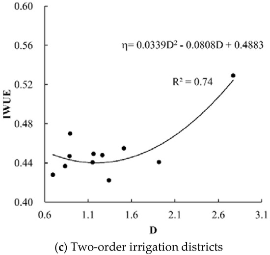 In the three-order and four-order irrigation districts, the IWUE decreased with a certain interval as D increased. Considering the influence of the irrigation area, further analysis of this phenomenon will be conducted.