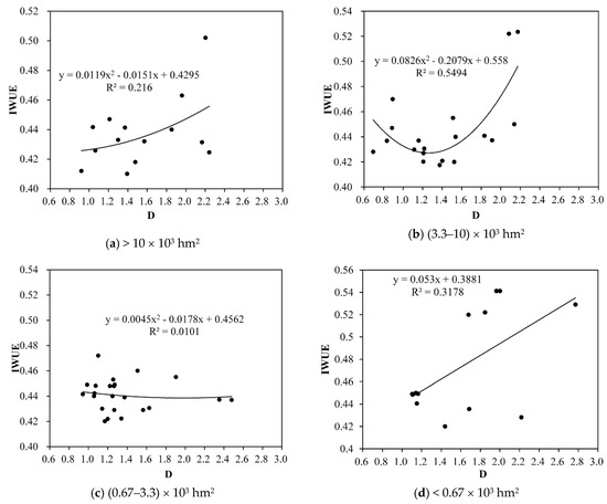As shown in Figure 5, in the three- and four-grade irrigation areas, (1) the IWUE of the irrigation districts with an area of more than 10 × 103 hm2 generally increased as the fractal dimension increased, which showed that increasing the complexity of the canal system can increase the IWUE. Combined with Equation (5) above, increasing the fractal dimension can be achieved by increasing the bifurcation ratio and decreasing the length ratio. Properly lengthening the bifurcation canal system and increasing the number of canal systems so that the canal system can fully fill the irrigation area, and the diverted irrigation water can be more efficiently transported to the fields. (2) A high correlation was observed between the IWUE and D in the (3.3–10) × 103 hm2 irrigation district (R2 = 0.5494), which indicated that the correlation between the D value for the medium-scale irrigation district and the IWUE was stronger and variations in the values of D had a great influence on the IWUE. Two singular points were observed, and the fitting curve showed a significant decrease before and after the increase; however, most of the data showed a trend in which the IWUE decreased along with D. The data showed that certain water conveyance channels were relatively redundant in these irrigation areas. When the canal length meets the irrigation demand, more refined canal systems may cause more leakage and evaporation losses. At this time, the IWUE can be improved by transforming the canal systems by changing long canals into short canals and increasing the impermeability rate to enhance the water transport capacity. (3) Clear morphological characteristics were not observed for the curve fitted for the (0.67–3.3) × 103 hm2 area, the overall performance decreased, and the fractal dimension was concentrated between 1.0 and 1.4. The lower complexity of the canal system was sufficient to meet the irrigation needs of the crops; thus, increasing the numbers of the canals was relatively redundant for such smaller irrigation areas. (4) A clear trend was not observed for the curve for the IWUE and D of irrigation districts with areas below 0.67 × 103 hm2. Because of the smaller area, the distribution of irrigation channels may have a lower impact on the IWUE.