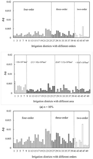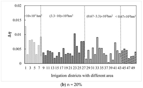 Because the dimensions have a certain range of values, the Δη values of each irrigation district at n = 10% and 20% were calculated as shown in Figure 6.
