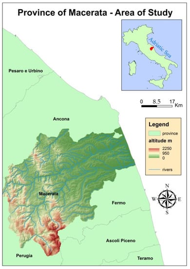 Macerata is the largest of the provinces in the Marche Region of Italy, with an area of about 2800 km2 (Figure 1). Macerata is bordered by the province of Perugia (Umbria Region) to the west, by the Adriatic Sea, an arm of the Mediterranean Sea, to the east, and by three other provinces in the same Region, Ancona to the north, Fermo to the south and Ascoli Piceno to the southwest.