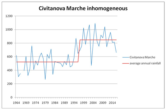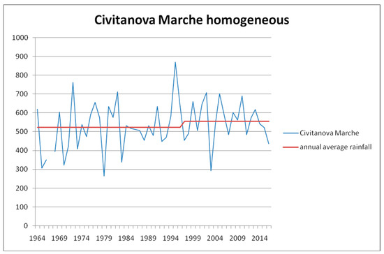 The reference time series obtained with EBK was related with the candidate time series, in order to investigate if this series (candidate) needs homogenization. The result of subsequent homogenization leads to 2 weather stations homogenized for temperature and 2 rain gauges for precipitation. In particular, the case of Civitanova Marche, a city on the Adriatic coast, is particularly evident with a growing mean, after the breakpoint, of about 300 mm (Figure 2) which is homogenized by the tests [,] (Figure 3).