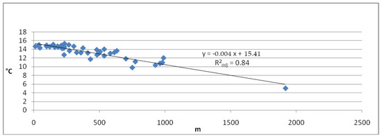 Thus, Table 2 and Table 3 highlight the goodness of the correlation between altitude and temperature or precipitation, in order to have a reliable independent variable for interpolation by cokriging methods. A good correlation for the distance from the sea, even if lower than with altitude, can also be observed for precipitation.