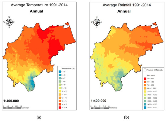Meanannual temperature (a) and meanannual precipitation (b) in the period 1991–2014 for Macerata province.
