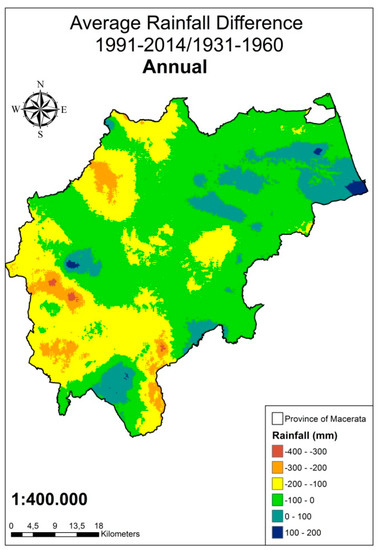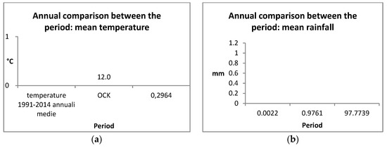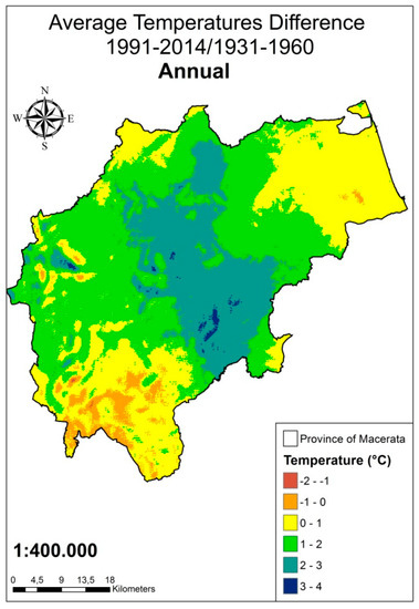 Finally, the most important part of this research is represented by the comparison between the interpolation maps of 1931–1960 and those of 1991–2014, to assess climate change in the last 60 years. These variation maps (Figure 7) were obtained through the raster math tool, by subtracting to the values of 1991–2014 from those of 1931–1960.